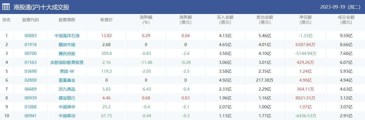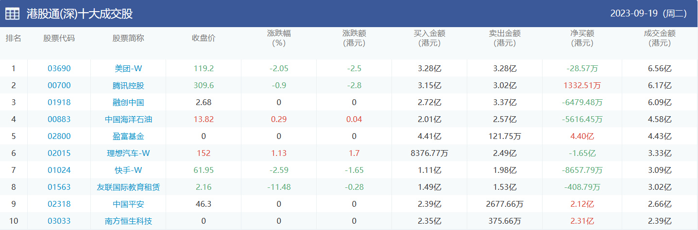 亚汇网实时数据统计:截至9月20日收盘,中国海洋石油、融创中国、腾讯控股位居港股通(沪)成交前三,美团-w、腾讯控股、融创中国位居股通(深)成交前三。