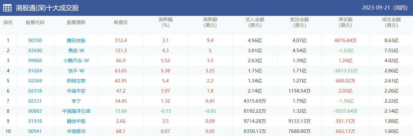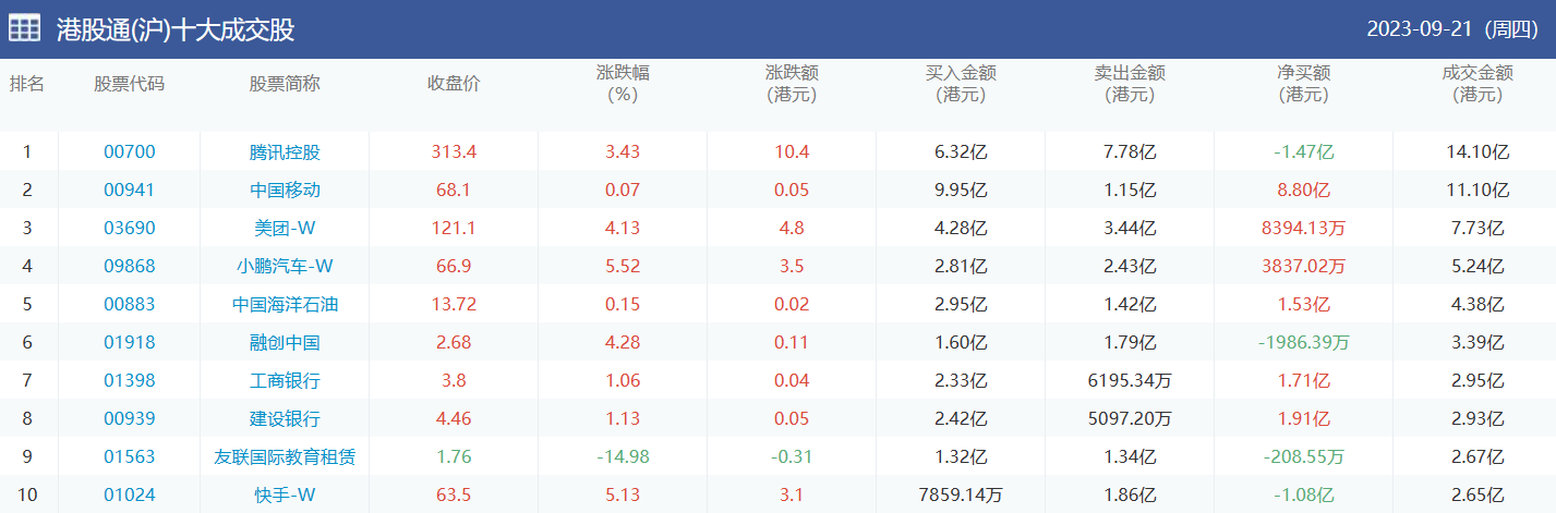 亚汇网实时数据统计:截至9月22日收盘,腾讯控股、中国移动、美团-w位居港股通(沪)成交前三,腾讯控股、美团-w、小鹏汽车位居股通(深)成交前三。