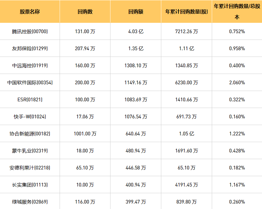 9月25日港股回购概况:晨讯科技(02000)、摩比发展(00947)、新鸿基公司(00086)、希玛眼科(03309)、亚洲金融(00662)、蒙牛乳业(02319)、天福(06868)、DYNAM JAPAN(06889)、首佳科技(00103)、东风集团股份(00489)、绿城服务(02869)、中国软件国际(00354)、腾讯控股(00700)、昊海生物科技(06826)、亿胜生物科技(01061)、中远海控(0)、民银资本(01141)、金科服务(09666)、赛晶科技(00580)、中国石油化工股份(00386)、友邦保险(01299)、安德利果汁(02218)、亿都(国际控股)(00259)、复星国际(00656)、长实集团(01113)、旭日企业(00393)、协合新能源(00182)、彩客新能源(01986)、永达汽车(03669)、现代牙科(03600)、天立国际控股(01773)、汇量科技(01860)、快手-W(01024)、ESR(01821)、康圣环球(09960)、思派健康(00314)、美丽田园医疗健康(02373)于2023年9月22日进行了回购。其中,回购金额最大的为腾讯控股(00700),回购数量131.00 万,回购金额4.03 亿元。