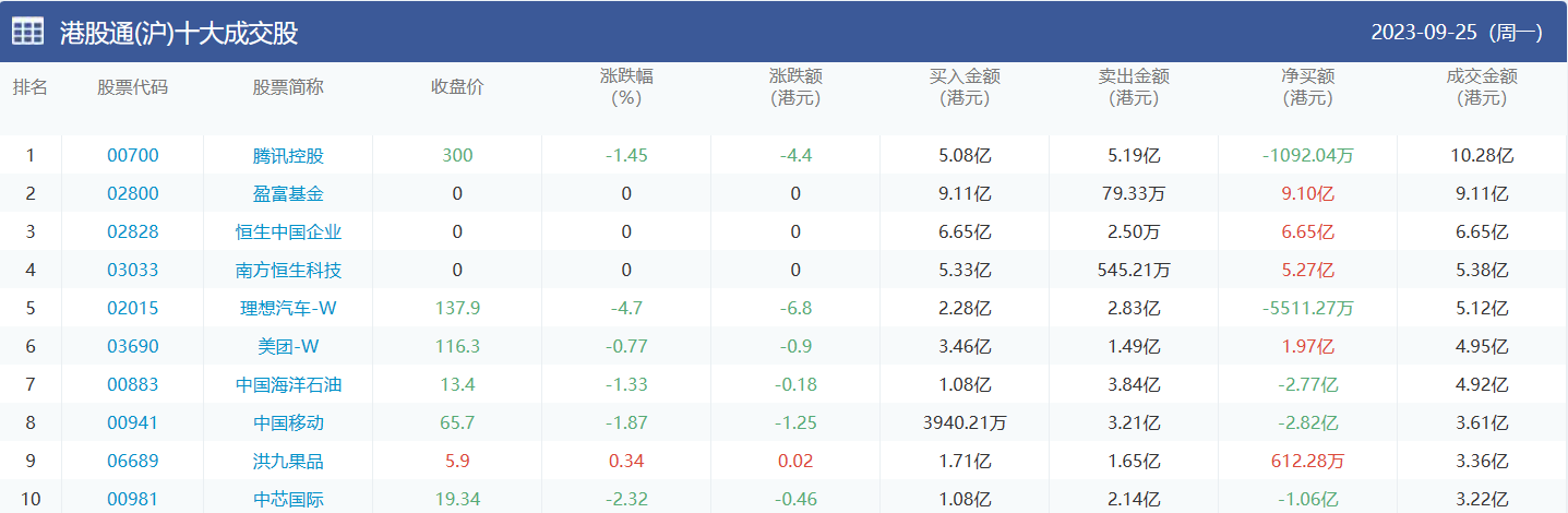 亚汇网实时数据统计:截至9月26日收盘,腾讯控股、盈富基金、恒生中国企业位居港股通(沪)成交前三,腾讯控股、盈富基金、美团-w位居股通(深)成交前三。