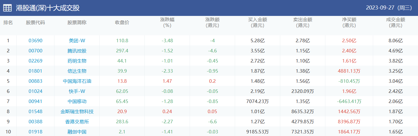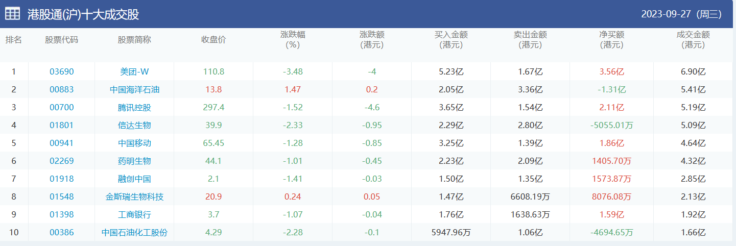亚汇网实时数据统计:截至9月28日收盘,美团-w、中国海洋石油、腾讯控股位居港股通(沪)成交前三,美团-w、腾讯控股、药明生物位居股通(深)成交前三。