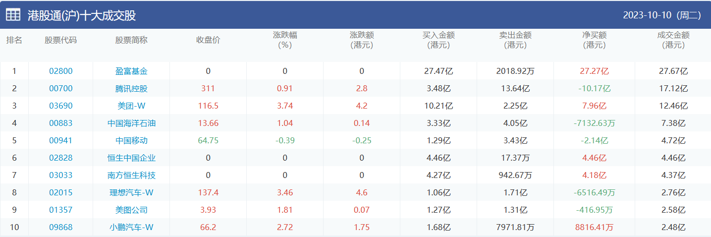 亚汇网实时数据统计:截至10月11日收盘,盈富基金、腾讯控股、美团-w位居港股通(沪)成交前三,盈富基金、腾讯控股、美团-w位居股通(深)成交前三。