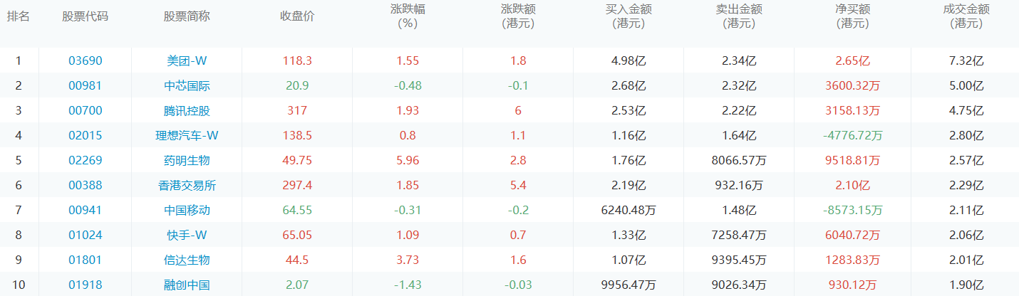 亚汇网10月12日港股通数据统计显示:美团-w净买入额居首,达4.98亿港元,美团-w净卖出额居第一位。