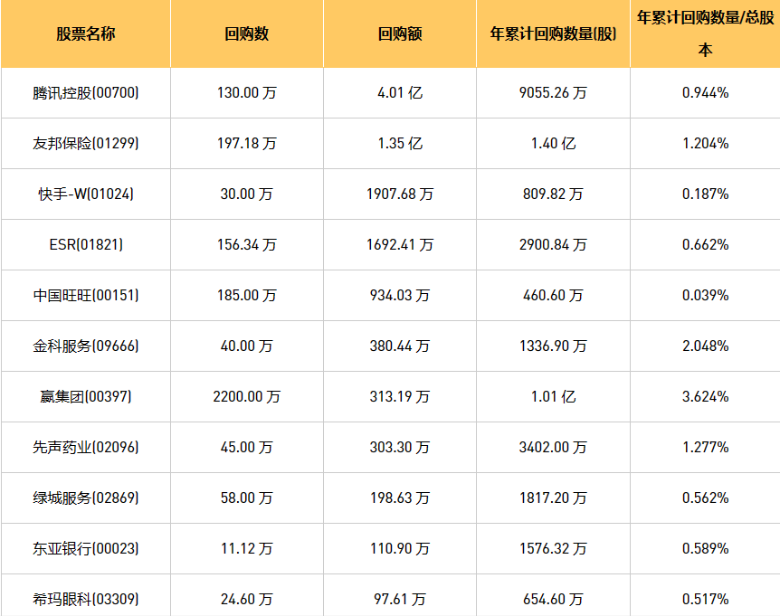 10月16日港股回购概况:摩比发展(00947)、东亚银行(00023)、天福(06868)、亿胜生物科技(01061)、绿城服务(02869)、清科创业(01945)、友邦保险(01299)、金科服务(09666)、希玛眼科(03309)、嬴集团(00397)、现代牙科(03600)、亿都(国际控股)(00259)、腾讯控股(00700)、乐声电子(00213)、中国旺旺(00151)、汇量科技(01860)、创胜集团-B(06628)、德银天下(02418)、彩客新能源(01986)、旭日企业(00393)、先声药业(02096)、北京能源国际(00686)、赛晶科技(00580)、快手-W(01024)、ESR(01821)、康圣环球(09960)、中电光谷(00798)于2023年10月13日进行了回购。其中,回购金额最大的为腾讯控股(00700),回购数量130.00 万,回购金额4.01 亿元。