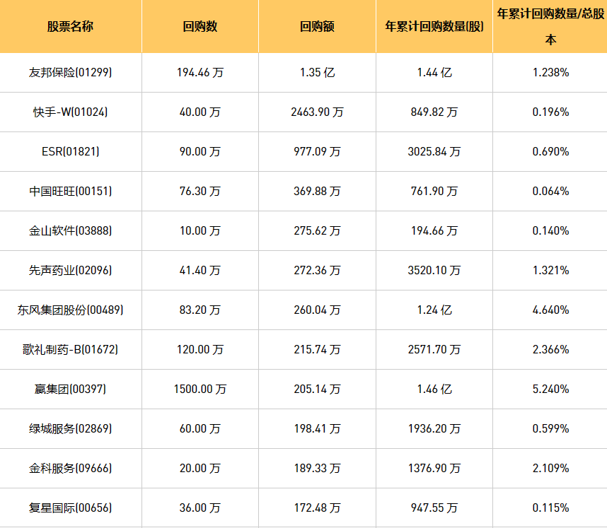 10月18日港股回购概况:希玛眼科(03309)、摩比发展(00947)、天福(06868)、绿城服务(02869)、科联系统(00046)、中国旺旺(00151)、首佳科技(00103)、金科服务(09666)、亿都(国际控股)(00259)、东亚银行(00023)、清科创业(01945)、友邦保险(01299)、德银天下(02418)、复星国际(00656)、创胜集团-B(06628)、东风集团股份(00489)、嬴集团(00397)、彩客新能源(01986)、VESYNC(02148)、歌礼制药-B(01672)、民银资本(01141)、乐声电子(00213)、金山软件(03888)、赛晶科技(00580)、旭日企业(00393)、先声药业(02096)、北京能源国际(00686)、ESR(01821)、现代牙科(03600)、快手-W(01024)、思派健康(00314)、康圣环球(09960)、中电光谷(00798)于2023年10月17日进行了回购。其中,回购金额最大的为友邦保险(01299),回购数量194.46 万,回购金额1.35 亿元。