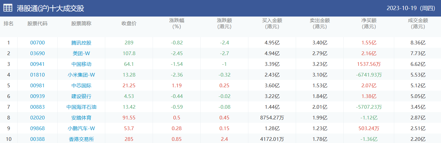 亚汇网实时数据统计:截至10月20日收盘,腾讯控股、美团-w、中国移动位居港股通(沪)成交前三,腾讯控股、美团-w、盈富基金位居股通(深)成交前三。