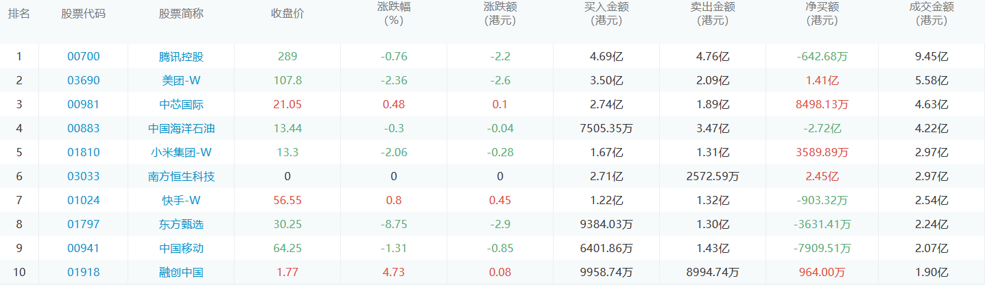 亚汇网10月23日港股通数据统计显示:腾讯控股买入额居首,达4.69亿港元,腾讯控股净卖出额居第一位。