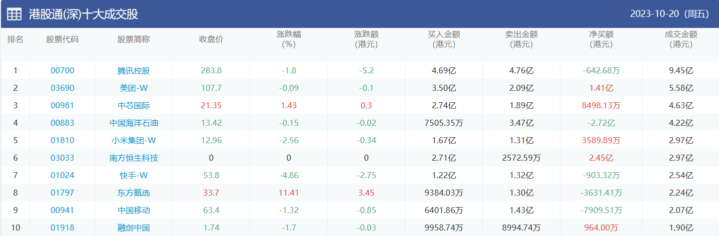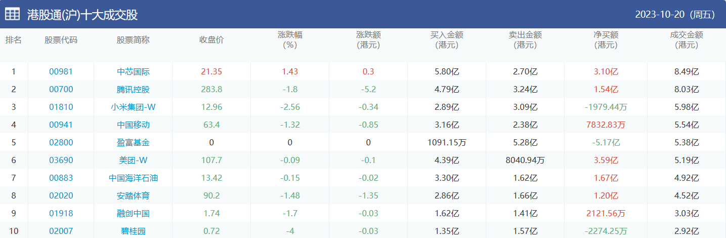 亚汇网实时数据统计:截至10月24日收盘,中芯国际、腾讯控股、小米集团-w位居港股通(沪)成交前三,腾讯控股、美团-w、中芯国际位居股通(深)成交前三。