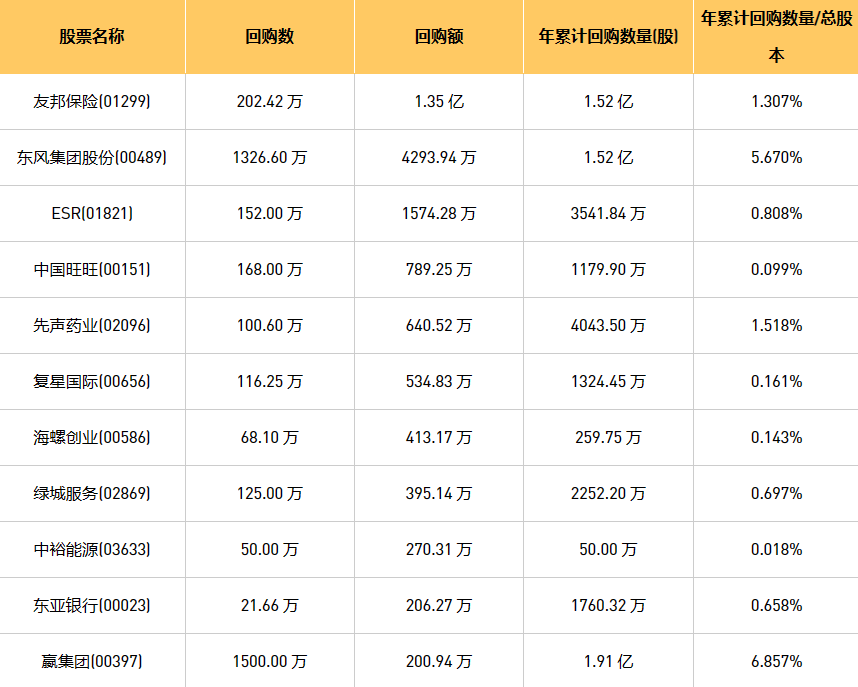 10月25日港股回购概况:希玛眼科(03309)、伟仕佳杰(00856)、摩比发展(00947)、亿胜生物科技(01061)、科联系统(00046)、东亚银行(00023)、清科创业(01945)、首佳科技(00103)、绿城服务(02869)、东风集团股份(00489)、天福(06868)、先声药业(02096)、友邦保险(01299)、金科服务(09666)、亿都(国际控股)(00259)、歌礼制药-B(01672)、海螺创业(00586)、嬴集团(00397)、民银资本(01141)、中裕能源(03633)、现代牙科(03600)、中国旺旺(00151)、复星国际(00656)、星光集团(00403)、创胜集团-B(06628)、彩客新能源(01986)、中石化炼化工程(02386)、旭日企业(00393)、ESR(01821)、康圣环球(09960)、中国淀粉(03838)、赛晶科技(00580)于2023年10月24日进行了回购。其中,回购金额最大的为友邦保险(01299),回购数量202.42 万,回购金额1.35 亿元。