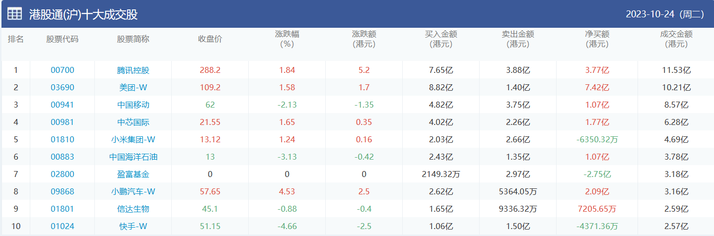 亚汇网实时数据统计:截至10月25日收盘,腾讯控股、美团-w、中国移动位居港股通(沪)成交前三,腾讯控股、美团-w、盈富基金位居股通(深)成交前三。
