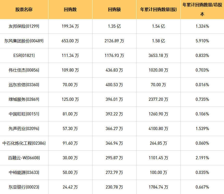 10月26日港股回购概况: 摩比发展(00947)、希玛眼科(03309)、伟仕佳杰(00856)、科联系统(00046)、星光集团(00403)、东亚银行(00023)、亿都(国际控股)(00259)、绿城服务(02869)、金科服务(09666)、亿胜生物科技(01061)、清科创业(01945)、中国旺旺(00151)、首佳科技(00103)、歌礼制药-B(01672)、中裕能源(03633)、东风集团股份(00489)、中国淀粉(03838)、友邦保险(01299)、现代牙科(03600)、嬴集团(00397)、乐声电子(00213)、民银资本(01141)、中石化炼化工程(02386)、德银天下(02418)、旭日企业(00393)、创胜集团-B(06628)、彩客新能源(01986)、百融云-W(06608)、ESR(01821)、远东宏信(03360)、先声药业(02096)、赛晶科技(00580)、天福(06868)、康圣环球(09960)、香港科技探索(01137)、美因基因(06667)于2023年10月25日进行了回购。其中,回购金额最大的为友邦保险(01299),回购数量199.34 万,回购金额1.35 亿元。