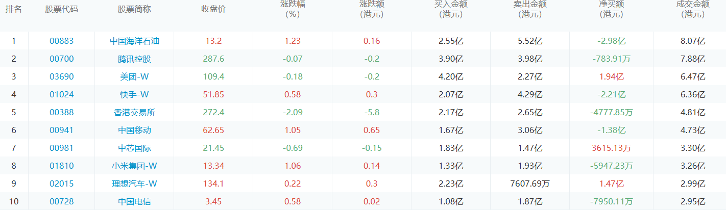 亚汇网10月26日港股通数据统计显示:美团-w净买入额居首,达4.20亿港元,中国海洋石油净卖出额居第一位。