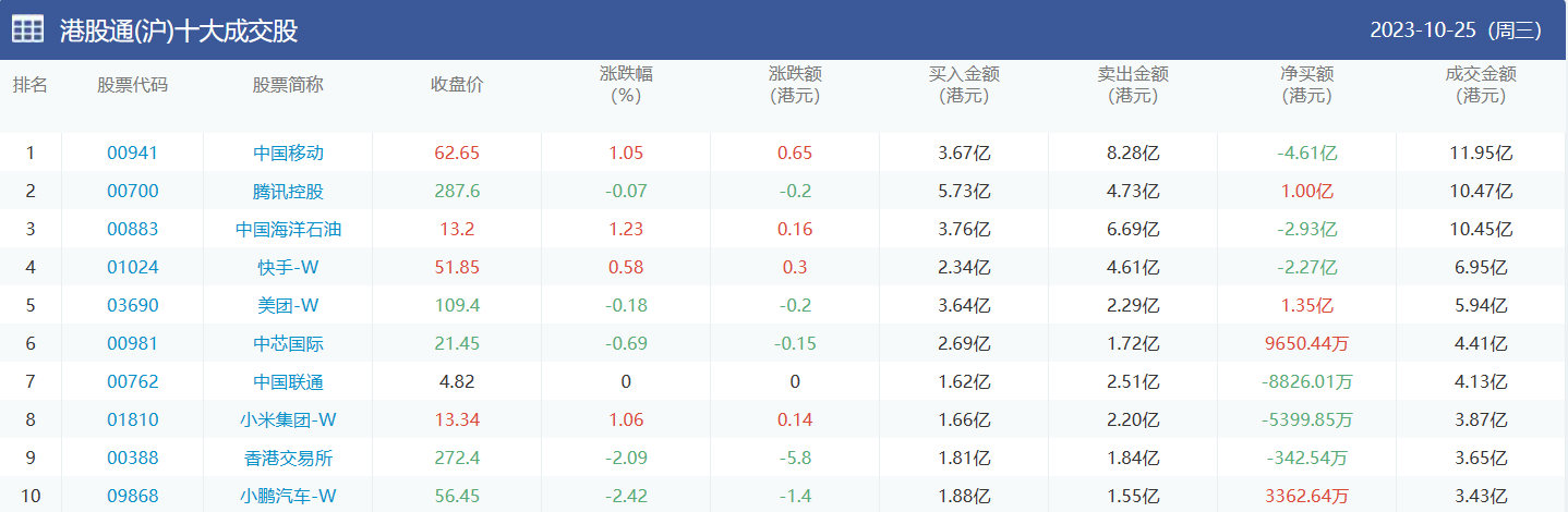 亚汇网实时数据统计:截至10月26日收盘,中国移动、腾讯控股、中国海洋石油位居港股通(沪)成交前三,中国海洋石油、腾讯控股、美团-w位居股通(深)成交前三。
