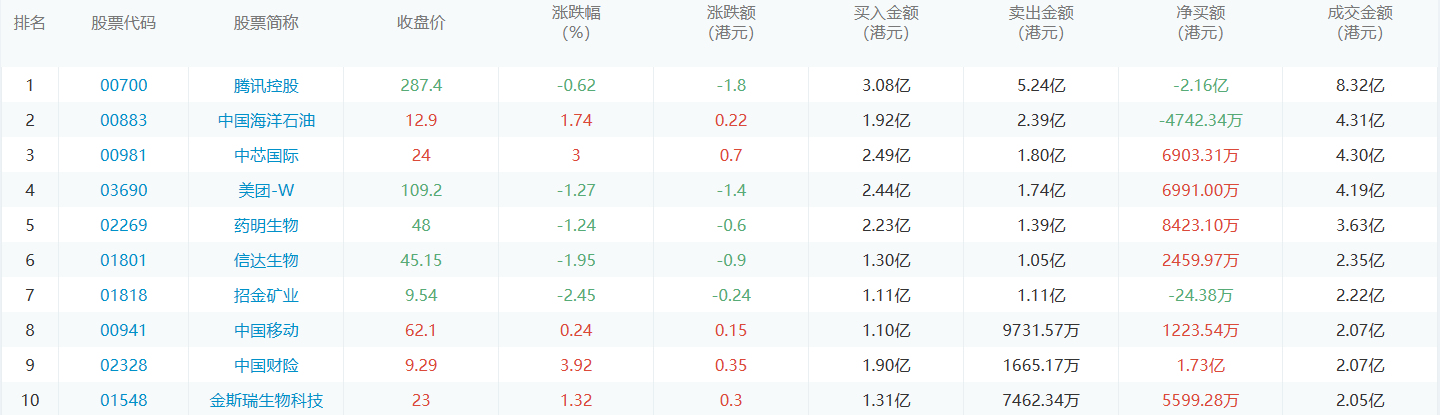 亚汇网11月1日港股通数据统计显示:腾讯控股净买入额居首,达3.08亿港元,腾讯控股净卖出额居第一位。