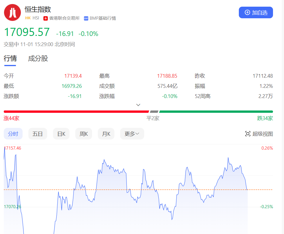 香港恒生指数开盘涨0.16%,三大指数早盘集体高开后迅速下挫,随后探底回升,恒指及国指午前一度翻红,此后全天呈窄幅震荡走势。截止收盘,恒生指数跌0.06%或10.7点,报17101.78点,全日成交额679.7亿港元;恒生国企指数跌0.04%,报5859.57点;恒生科技指数跌0.18%,报3752.37点。