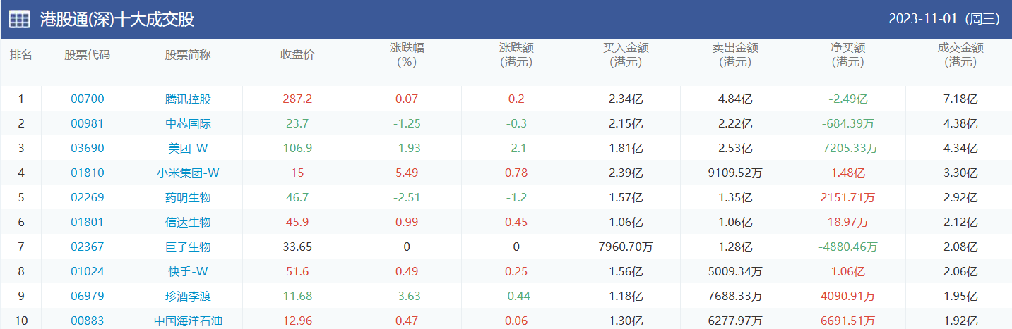 亚汇网实时数据统计:截至11月2日收盘,中芯国际、腾讯控股、美团-w位居港股通(沪)成交前三,腾讯控股、中芯国际、美团-w位居股通(深)成交前三。