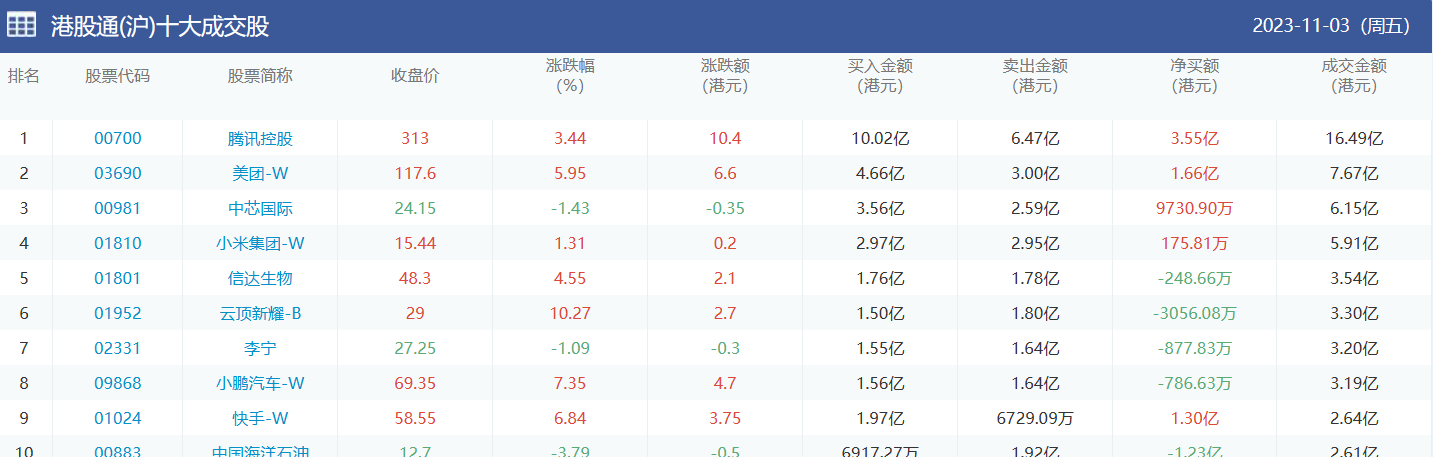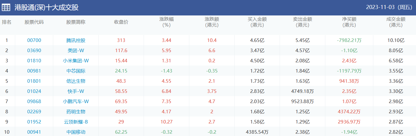 亚汇网实时数据统计:截至11月6日收盘,腾讯控股、美团-w、中芯国际位居港股通(沪)成交前三,腾讯控股、美团-w、小米集团-w位居股通(深)成交前三。