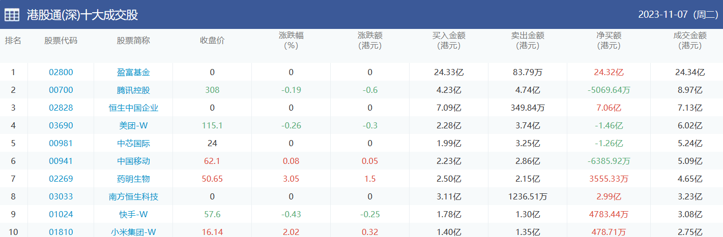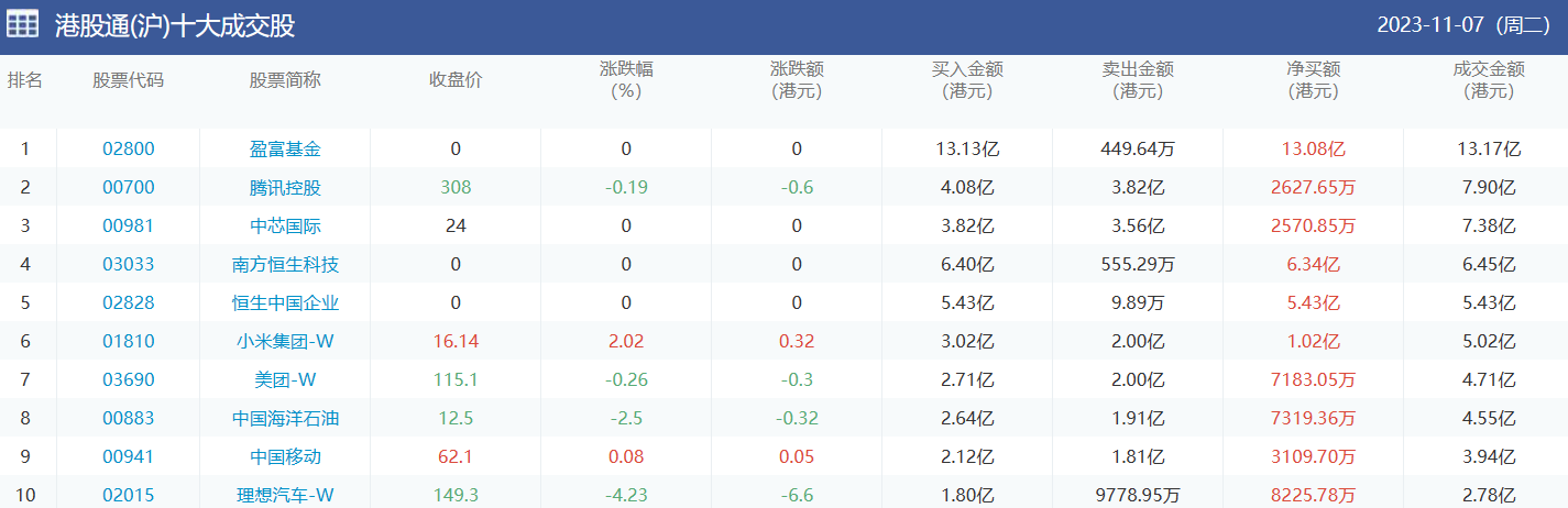 亚汇网实时数据统计:截至11月8日收盘,盈富基金、腾讯控股、中芯国际位居港股通(沪)成交前三,盈富基金、腾讯控股、恒生中国企业位居股通(深)成交前三。