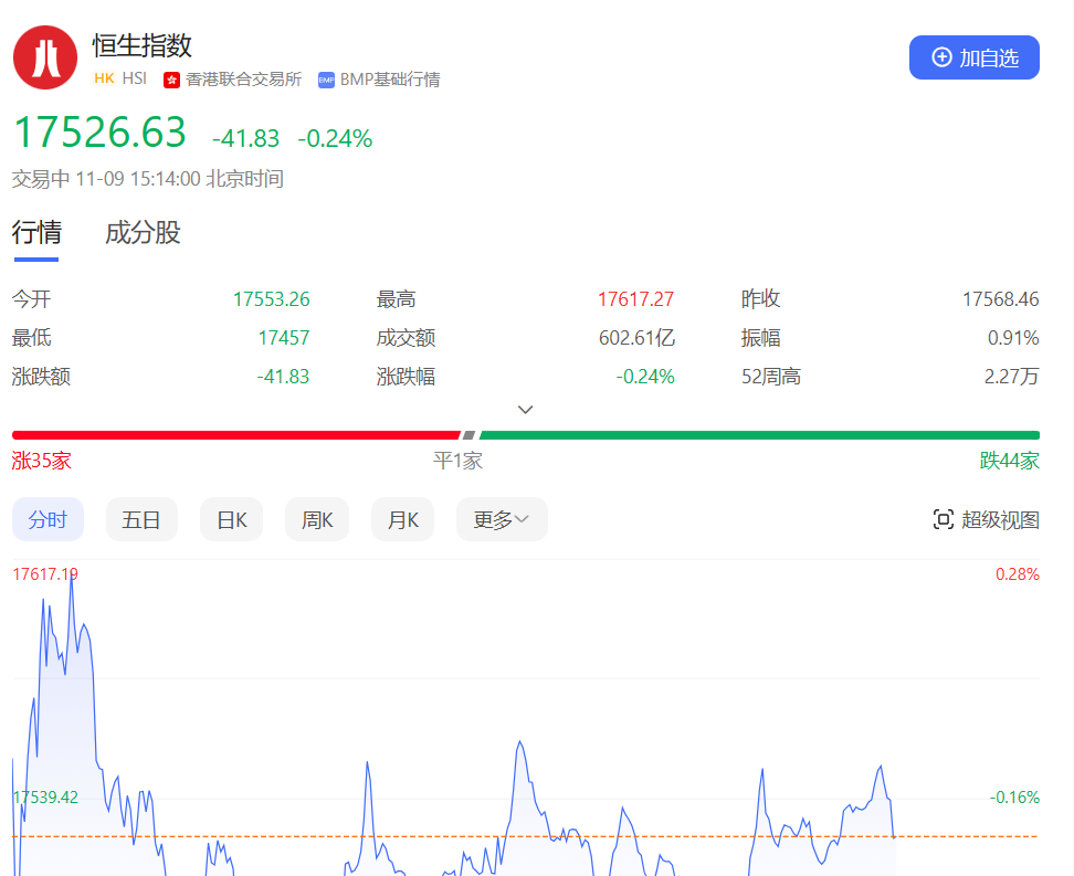 香港恒生指数开盘跌0.09%,早盘恒指小幅低开,此后全天冲高回落。截止收盘,恒生指数跌0.33%或57.17点,报17511.29点,全日成交额753.2亿港元;恒生国企指数跌0.16%,报6030.26点;恒生科技指数涨0.08%,报4024.24点。