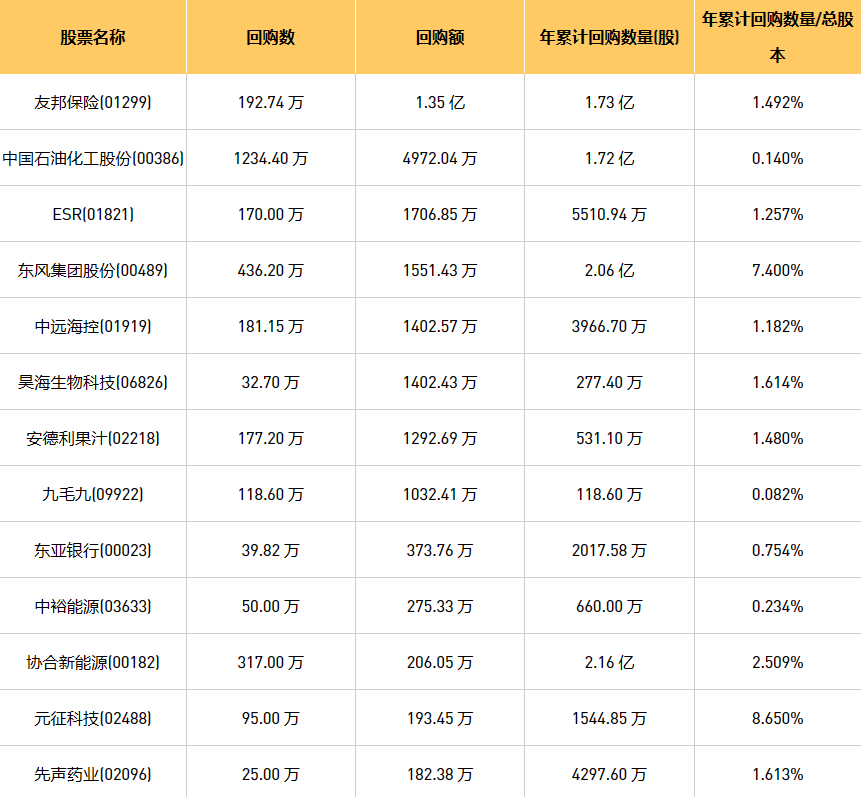 11月10日港股回购概况:伟仕佳杰(00856)、摩比发展(00947)、希玛眼科(03309)、东风集团股份(00489)、安德利果汁(02218)、金科服务(09666)、绿城服务(02869)、中国石油化工股份(00386)、先声药业(02096)、友邦保险(01299)、东亚银行(00023)、中远海控(0)、赛晶科技(00580)、昊海生物科技(06826)、歌礼制药-B(01672)、中裕能源(03633)、中石化炼化工程(02386)、上海石油化工股份(00338)、IGG(00799)、九毛九(09922)、天福(06868)、归创通桥-B(02190)、中国旭阳集团(01907)、元征科技(02488)、中电光谷(00798)、ESR(01821)、德银天下(02418)、协合新能源(00182)、康圣环球(09960)于2023年11月9日进行了回购。其中,回购金额最大的为友邦保险(01299),回购数量192.74 万,回购金额1.35 亿元。