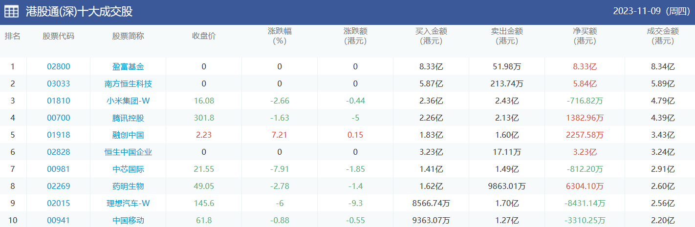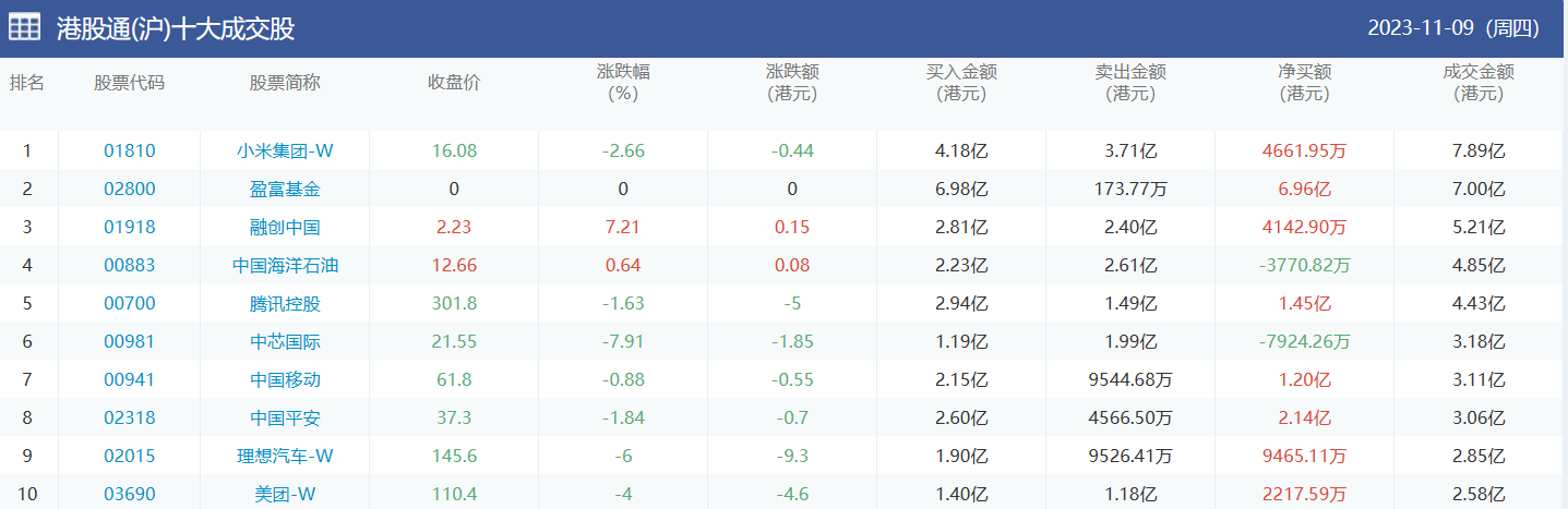 亚汇网实时数据统计:截至11月10日收盘,小米集团-w、盈富基金、融创中国位居港股通(沪)成交前三,盈富基金、南方恒生企业、小米集团-w位居股通(深)成交前三。
