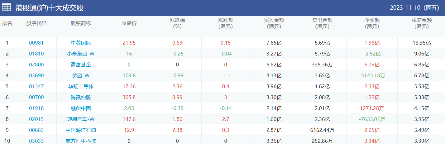 亚汇网实时数据统计:截至11月13日收盘,中芯国际、小米集团-w、盈富基金位居港股通(沪)成交前三,中芯国际、盈富基金、美团-w位居股通(深)成交前三。