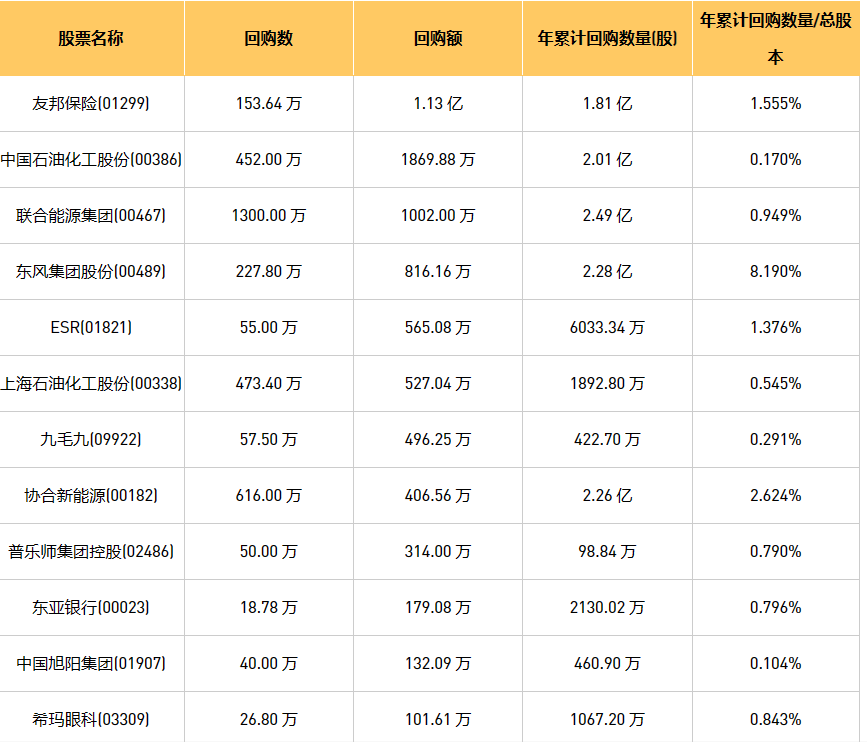 11月16日港股回购概况:摩比发展(00947)、亿胜生物科技(01061)、富智康集团(02038)、安德利果汁(02218)、亚洲金融(00662)、首佳科技(00103)、天福(06868)、绿城服务(02869)、新鸿基公司(00086)、东亚银行(00023)、东风集团股份(00489)、金科服务(09666)、中国石油化工股份(00386)、友邦保险(01299)、清科创业(01945)、九毛九(09922)、美因基因(06667)、希玛眼科(03309)、普乐师集团控股(02486)、未来发展控股(01259)、德银天下(02418)、联合能源集团(00467)、上海石油化工股份(00338)、金茂源环保(06805)、歌礼制药-B(01672)、协合新能源(00182)、归创通桥-B(02190)、赛晶科技(00580)、彩客新能源(01986)、中石化炼化工程(02386)、阜丰集团(00546)、中国旭阳集团(01907)、中电光谷(00798)、ESR(01821)、福森药业(01652)、康圣环球(09960)于2023年11月15日进行了回购。其中,回购金额最大的为友邦保险(01299),回购数量153.64 万,回购金额1.13 亿元。