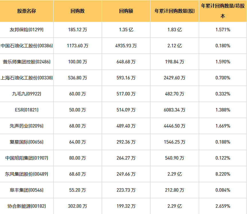 11月17日港股回购概况:中国淀粉(03838)、新鸿基公司(00086)、安德利果汁(02218)、绿城服务(02869)、摩比发展(00947)、中国石油化工股份(00386)、东风集团股份(00489)、金科服务(09666)、先声药业(02096)、天福(06868)、东亚银行(00023)、九毛九(09922)、友邦保险(01299)、普乐师集团控股(02486)、希玛眼科(03309)、归创通桥-B(02190)、金茂源环保(06805)、美因基因(06667)、赛晶科技(00580)、昊海生物科技(06826)、上海石油化工股份(00338)、未来发展控股(01259)、百融云-W(06608)、复星国际(00656)、旭日企业(00393)、歌礼制药-B(01672)、德银天下(02418)、中国旭阳集团(01907)、思考乐教育(01769)、中电光谷(00798)、阜丰集团(00546)、协合新能源(00182)、康圣环球(09960)、ESR(01821)于2023年11月16日进行了回购。其中,回购金额最大的为友邦保险(01299),回购数量185.12 万,回购金额1.35 亿元。