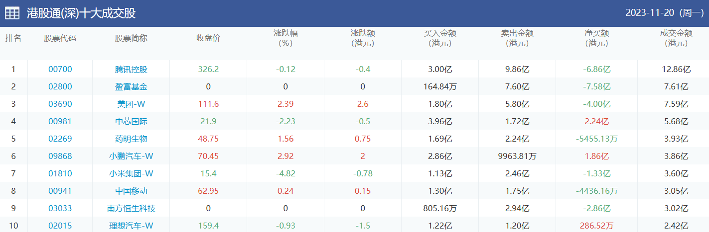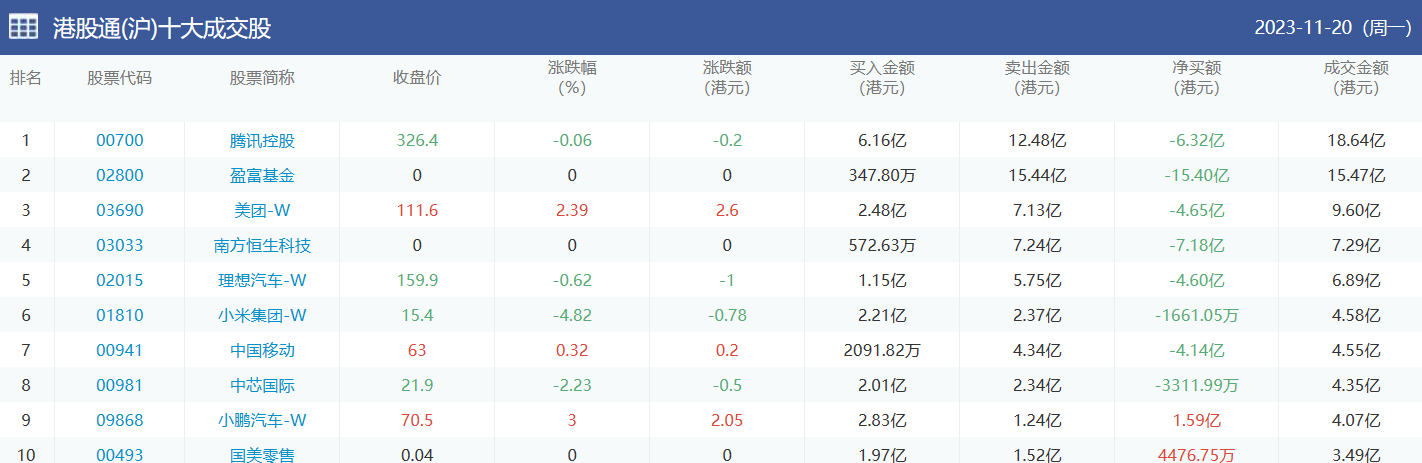 亚汇网实时数据统计:截至11月21日收盘,腾讯控股、盈富基金、美团-w位居港股通(沪)成交前三,腾讯控股、盈富基金、美团-w位居股通(深)成交前三。