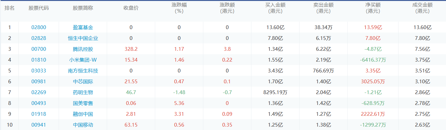 亚汇网11月23日港股通数据统计显示:盈富基金净买入额居首,达13.60亿港元,腾讯控股净卖出额居第一位。