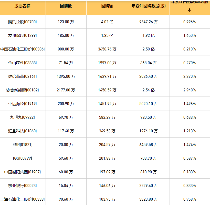 11月24日港股回购概况:健倍苗苗(02161)、安德利果汁(02218)、摩比发展(00947)、首佳科技(00103)、美因基因(06667)、东亚银行(00023)、金利来集团(00533)、旭辉永升服务(01995)、中国石油化工股份(00386)、新鸿基公司(00086)、九毛九(09922)、腾讯控股(00700)、思考乐教育(01769)、天福(06868)、清科创业(01945)、归创通桥-B(02190)、金科服务(09666)、中远海控(0)、友邦保险(01299)、亿胜生物科技(01061)、德银天下(02418)、亚洲金融(00662)、绿城服务(02869)、歌礼制药-B(01672)、上海石油化工股份(00338)、旭日企业(00393)、中国旭阳集团(01907)、创胜集团-B(06628)、IGG(00799)、汇量科技(01860)、美丽田园医疗健康(02373)、金山软件(03888)、ESR(01821)、赛晶科技(00580)、中电光谷(00798)、协合新能源(00182)、康圣环球(09960)于2023年11月23日进行了回购。其中,回购金额最大的为腾讯控股(00700),回购数量123.00 万,回购金额4.02 亿元。