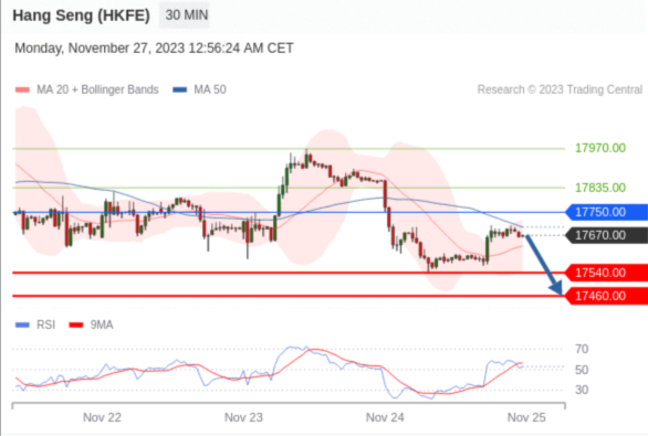 香港恒生指数期货 (X3) 当日内交易策略: 在 17750.00 之下 目标价位为 17540.00 (20231127)