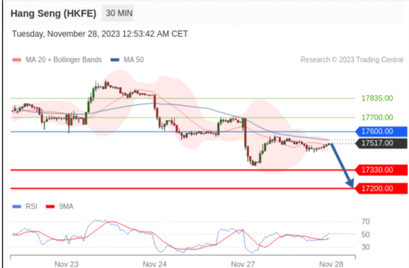 在 17600.00 之下,看跌,目标价位为 17330.00 ,然后为 17200.00 。