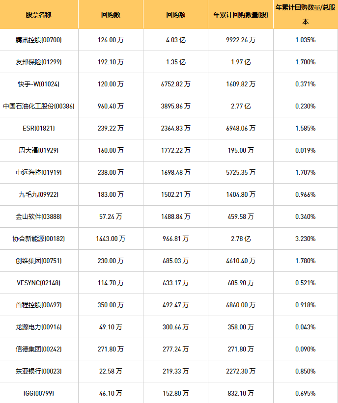 11月29日港股回购概况:旭辉永升服务(01995)、金利来集团(00533)、摩比发展(00947)、亿胜生物科技(01061)、中国石油化工股份(00386)、新鸿基公司(00086)、九毛九(09922)、互太纺织(01382)、天福(06868)、腾讯控股(00700)、清科创业(01945)、歌礼制药-B(01672)、友邦保险(01299)、创维集团(00751)、微泰医疗-B(02235)、归创通桥-B(02190)、东亚银行(00023)、中远海控(0)、金科服务(09666)、上海石油化工股份(00338)、首程控股(00697)、首佳科技(00103)、VESYNC(02148)、金山软件(03888)、旭日企业(00393)、IGG(00799)、香港科技探索(01137)、信德集团(00242)、ESR(01821)、龙源电力(00916)、周大福(01929)、美因基因(06667)、汇量科技(01860)、快手-W(01024)、中国淀粉(03838)、绿城服务(02869)、协合新能源(00182)、阜丰集团(00546)、福森药业(01652)、康圣环球(09960)、中电光谷(00798)于2023年11月28日进行了回购。其中,回购金额最大的为腾讯控股(00700),回购数量126.00 万,回购金额4.03 亿元。