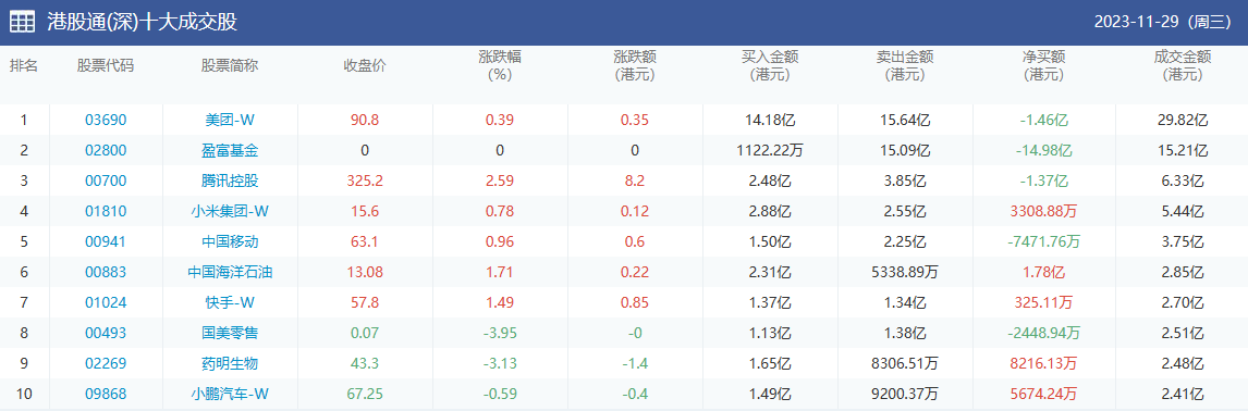 亚汇网实时数据统计:截至11月30日收盘,美团-w、盈富基金、腾讯控股位居港股通(沪)成交前三,美团-w、盈富基金、腾讯控股位居股通(深)成交前三。