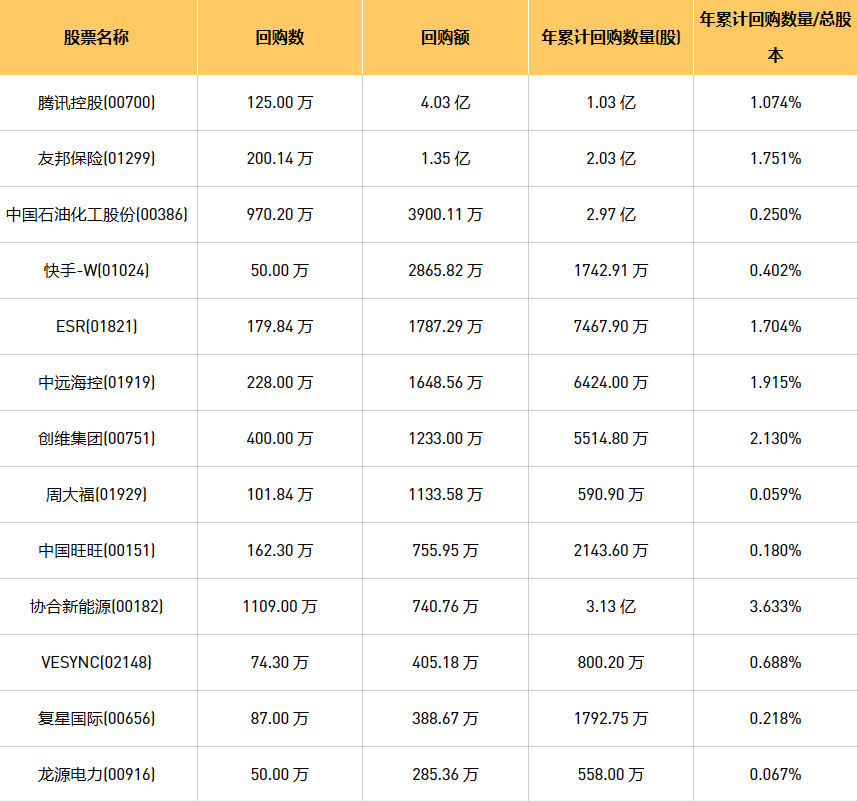 12月4日港股回购概况:中国淀粉(03838)、摩比发展(00947)、永安国际(00289)、旭辉永升服务(01995)、科联系统(00046)、东亚银行(00023)、中远海控(0)、协合新能源(00182)、亿胜生物科技(01061)、绿城服务(02869)、伟仕佳杰(00856)、创维集团(00751)、周大福(01929)、富智康集团(02038)、中国石油化工股份(00386)、天福(06868)、上海石油化工股份(00338)、腾讯控股(00700)、首程控股(00697)、友邦保险(01299)、中国旺旺(00151)、互太纺织(01382)、亿都(国际控股)(00259)、中裕能源(03633)、中石化炼化工程(02386)、彩客新能源(01986)、微泰医疗-B(02235)、天鸽互动(01980)、IGG(00799)、龙源电力(00916)、金科服务(09666)、旭日企业(00393)、VESYNC(02148)、汇量科技(01860)、赛晶科技(00580)、复星国际(00656)、首佳科技(00103)、歌礼制药-B(01672)、阜丰集团(00546)、中电光谷(00798)、快手-W(01024)、康圣环球(09960)、ESR(01821)于2023年12月1日进行了回购。其中,回购金额最大的为腾讯控股(00700),回购数量125.00 万,回购金额4.03 亿元。