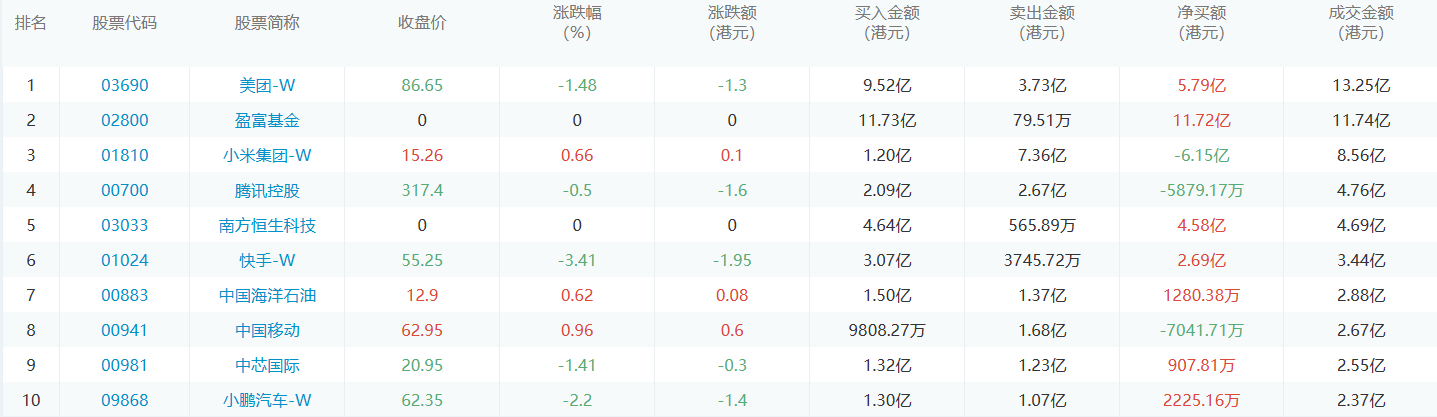 亚汇网12月4日港股通数据统计显示:盈富基金净买入额居首,达11.73亿港元,美团-w净卖出额居第一位。