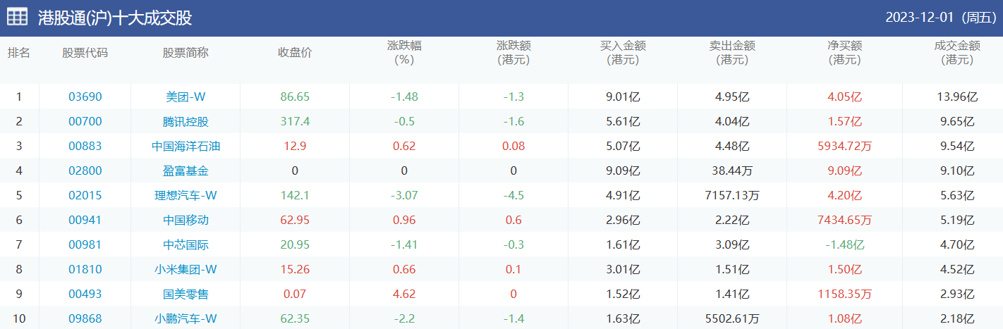 亚汇网实时数据统计:截至12月4日收盘,美团-w、腾讯控股、中国海洋石油位居港股通(沪)成交前三,美团-w、盈富基金、小米集团-w位居股通(深)成交前三。