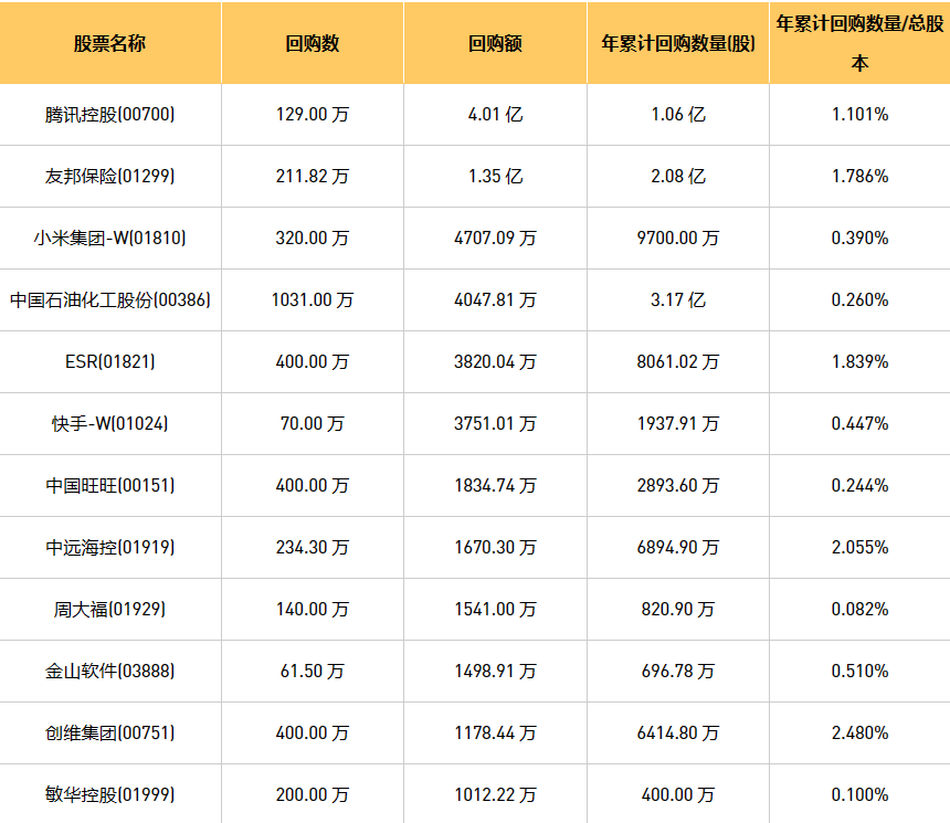 12月6日港股回购概况:旭辉永升服务(01995)、摩比发展(00947)、伟仕佳杰(00856)、创维集团(00751)、永安国际(00289)、科联系统(00046)、东亚银行(00023)、新鸿基公司(00086)、富智康集团(02038)、周大福(01929)、绿城服务(02869)、金利来集团(00533)、歌礼制药-B(01672)、龙源电力(00916)、腾讯控股(00700)、昊海生物科技(06826)、中国石油化工股份(00386)、赛晶科技(00580)、金科服务(09666)、首佳科技(00103)、微泰医疗-B(02235)、天福(06868)、亿胜生物科技(01061)、互太纺织(01382)、泡泡玛特(09992)、归创通桥-B(02190)、复星国际(00656)、亿都(国际控股)(00259)、金山软件(03888)、彩客新能源(01986)、友邦保险(01299)、天鸽互动(01980)、上海石油化工股份(00338)、中远海控(0)、中国旺旺(00151)、首程控股(00697)、中裕能源(03633)、汇量科技(01860)、敏华控股(01999)、VESYNC(02148)、协合新能源(00182)、小米集团-W(01810)、天立国际控股(01773)、快手-W(01024)、明源云(00909)、中电光谷(00798)、ESR(01821)、IGG(00799)、旭日企业(00393)、康圣环球(09960)、海伦司(09869)、瑞尔集团(06639)、香港科技探索(01137)、顺丰同城(09699)、阜丰集团(00546)于2023年12月5日进行了回购。其中,回购金额最大的为腾讯控股(00700),回购数量129.00 万,回购金额4.01 亿元。