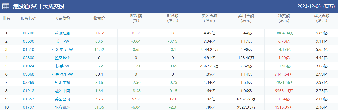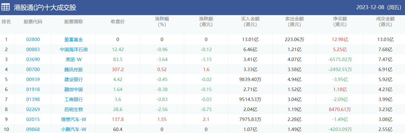 亚汇网实时数据统计:截至12月11日收盘,盈富基金、中国海洋石油、美团-w位居港股通(沪)成交前三,腾讯控股、美团-w、小米集团-w位居股通(深)成交前三。