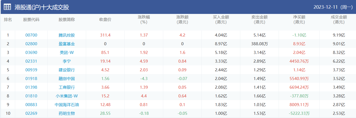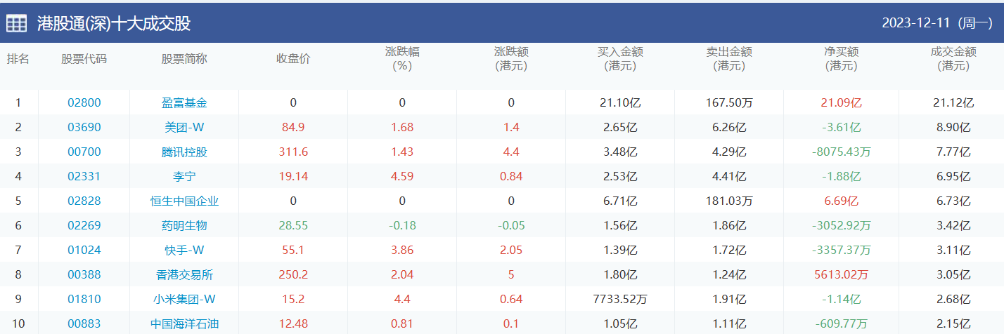 亚汇网实时数据统计:截至12月12日收盘,腾讯控股、盈富基金、美团-w位居港股通(沪)成交前三,盈富基金、腾讯控股、美团-w位居股通(深)成交前三。