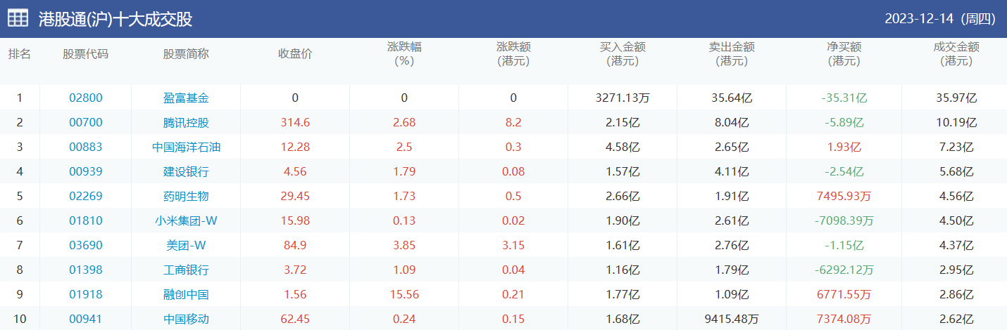 亚汇网实时数据统计:截至12月15日收盘,盈富基金、腾讯控股、中国海洋石油位居港股通(沪)成交前三,盈富基金、南方恒生科技、腾讯控股位居股通(深)成交前三。