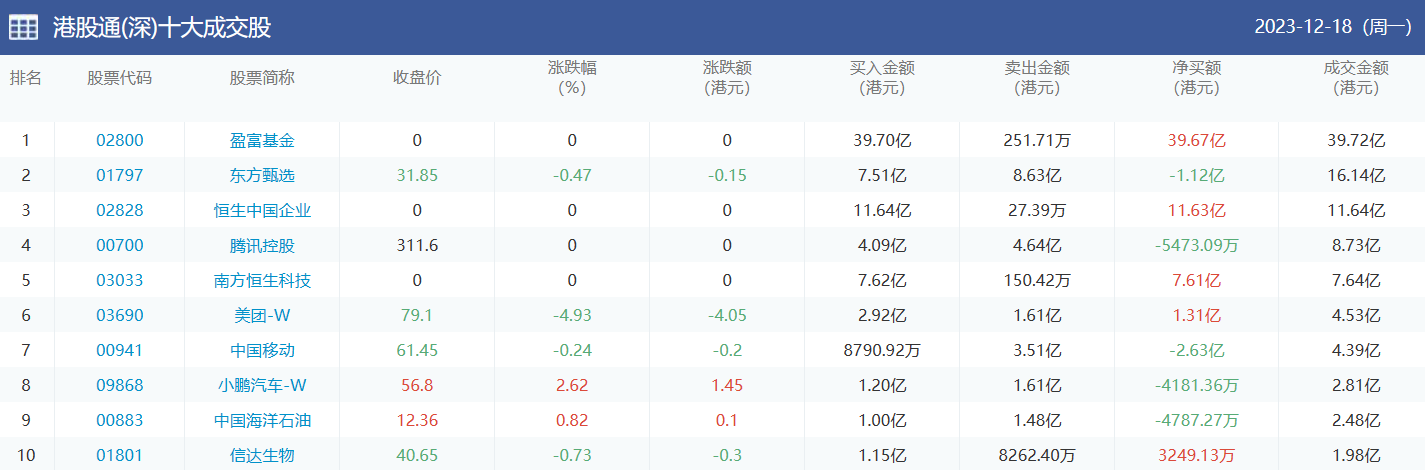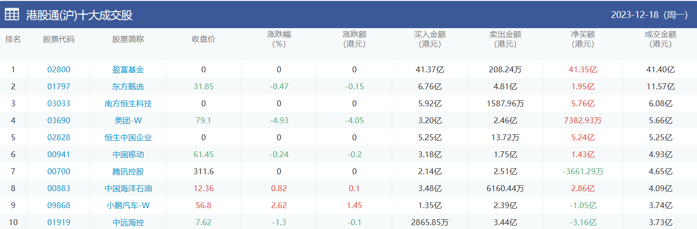 亚汇网实时数据统计:截至12月19日收盘盈富基金、东方甄选、南方恒生科技位居港股通(沪)成交前三,盈富基金、东方甄选、恒生中国企业位居股通(深)成交前三。