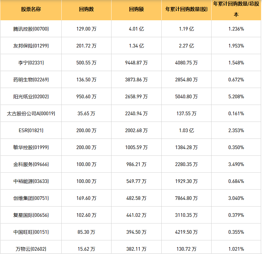 12月20日港股回购概况:名创优品(09896)、摩比发展(00947)、富智康集团(02038)、亿胜生物科技(01061)、天福(06868)、旭辉永升服务(01995)、首佳科技(00103)、北控城市资源(03718)、清科创业(01945)、昊海生物科技(06826)、阳光纸业(02002)、中远海控(0)、泡泡玛特(09992)、绿城服务(02869)、创维集团(00751)、上海石油化工股份(00338)、中石化炼化工程(02386)、津上机床中国(01651)、星盛商业(06668)、东亚银行(00023)、太古股份公司B(00087)、歌礼制药-B(01672)、首程控股(00697)、中裕能源(03633)、中国旺旺(00151)、复星国际(00656)、天鸽互动(01980)、德银天下(02418)、民银资本(01141)、太古股份公司A(00019)、欧康维视生物-B(01477)、美因基因(06667)、亿都(国际控股)(00259)、金科服务(09666)、旭日企业(00393)、龙源电力(00916)、首惠产业金融(00730)、李宁(02331)、VESYNC(02148)、赛晶科技(00580)、联康生物科技集团(00690)、腾讯控股(00700)、友邦保险(01299)、和铂医药-B(02142)、汇量科技(01860)、天立国际控股(01773)、ESR(01821)、协合新能源(00182)、阜丰集团(00546)、万物云(02602)、顺丰同城(09699)、敏华控股(01999)、康圣环球(09960)、福森药业(01652)、金阳新能源(01121)、安领国际(01410)、药明生物(02269)于2023年12月19日进行了回购。其中,回购金额最大的为腾讯控股(00700),回购数量129.00 万,回购金额4.01 亿元。
