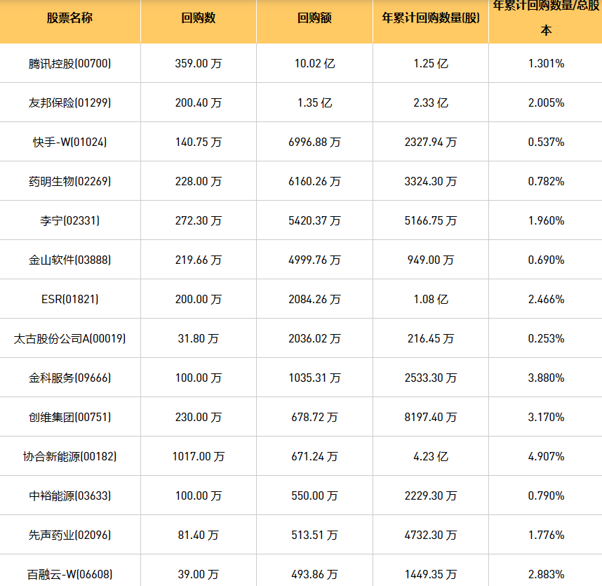 12月25日港股回购概况:旭辉永升服务(01995)、创维集团(00751)、亿胜生物科技(01061)、富智康集团(02038)、北控城市资源(03718)、盛龙锦秀国际(08481)、新鸿基公司(00086)、清科创业(01945)、太古股份公司B(00087)、太古股份公司A(00019)、中裕能源(03633)、天福(06868)、东亚银行(00023)、旭日企业(00393)、天鸽互动(01980)、汇量科技(01860)、绿城服务(02869)、亿都(国际控股)(00259)、友邦保险(01299)、首程控股(00697)、未来发展控股(01259)、复星国际(00656)、津上机床中国(01651)、归创通桥-B(02190)、上海石油化工股份(00338)、腾讯控股(00700)、李宁(02331)、中石化炼化工程(02386)、欧康维视生物-B(01477)、星盛商业(06668)、龙源电力(00916)、先声药业(02096)、金科服务(09666)、美因基因(06667)、赛晶科技(00580)、中远海控(0)、VESYNC(02148)、协合新能源(00182)、微泰医疗-B(02235)、百融云-W(06608)、联康生物科技集团(00690)、力劲科技(00558)、天立国际控股(01773)、阜丰集团(00546)、金山软件(03888)、歌礼制药-B(01672)、德银天下(02418)、福森药业(01652)、快手-W(01024)、ESR(01821)、顺丰同城(09699)、中电光谷(00798)、康圣环球(09960)、万物云(02602)、首惠产业金融(00730)、药明生物(02269)、金阳新能源(01121)于2023年12月22日进行了回购。其中,回购金额最大的为腾讯控股(00700),回购数量359.00 万,回购金额10.02 亿元。