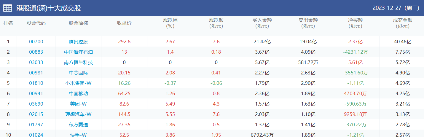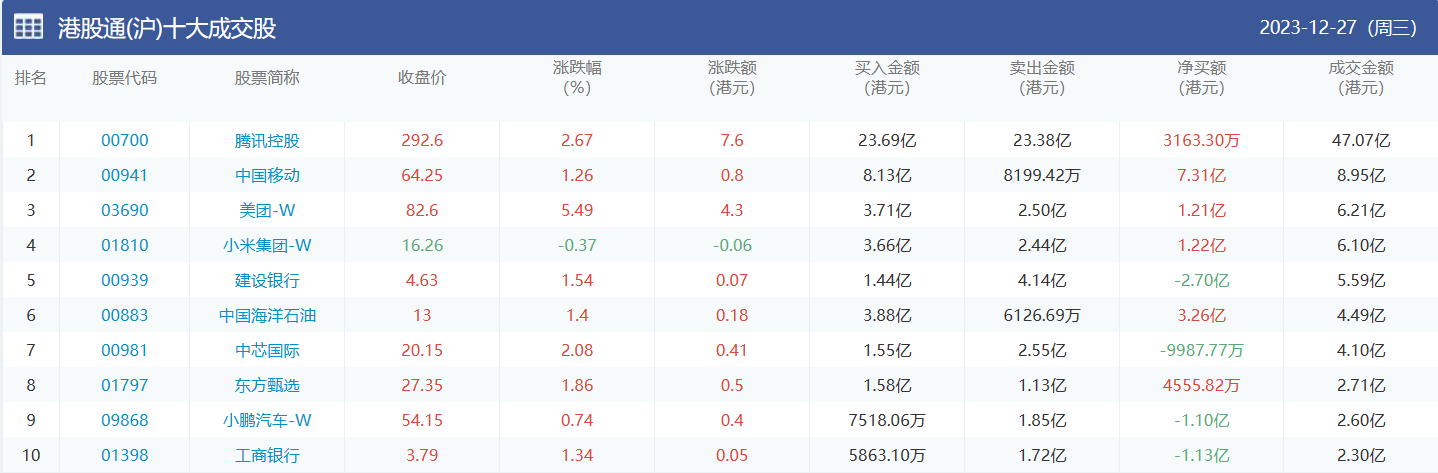 亚汇网实时数据统计:截至12月28日收盘腾讯控股、中国移动、美团-w位居港股通(沪)成交前三,腾讯控股、中国海洋石油、南方恒生科技位居股通(深)成交前三。