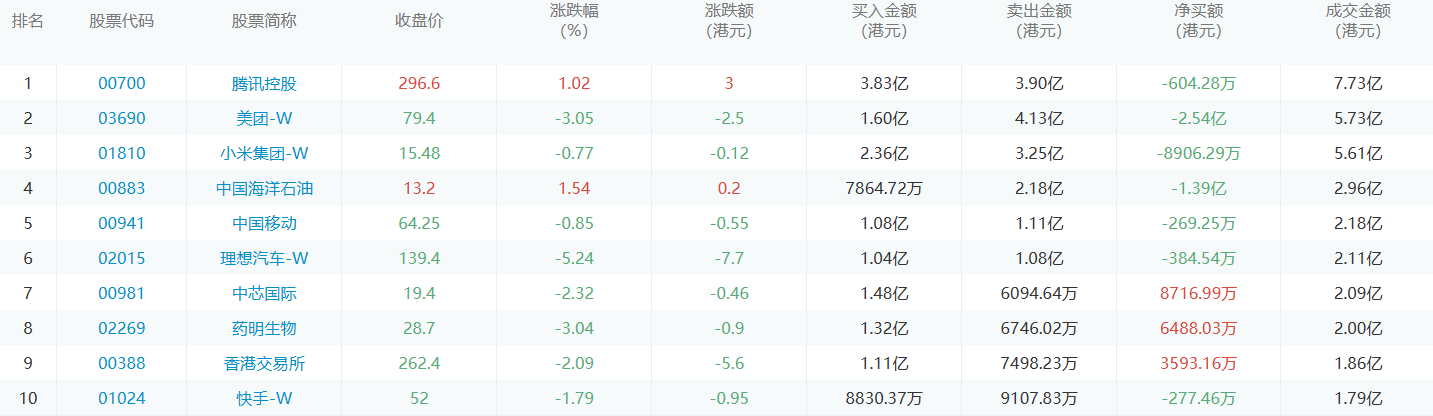 亚汇网1月2日港股通数据统计显示:腾讯控股净买入额居首,达3.83亿港元,美团-w净卖出额居第一位。