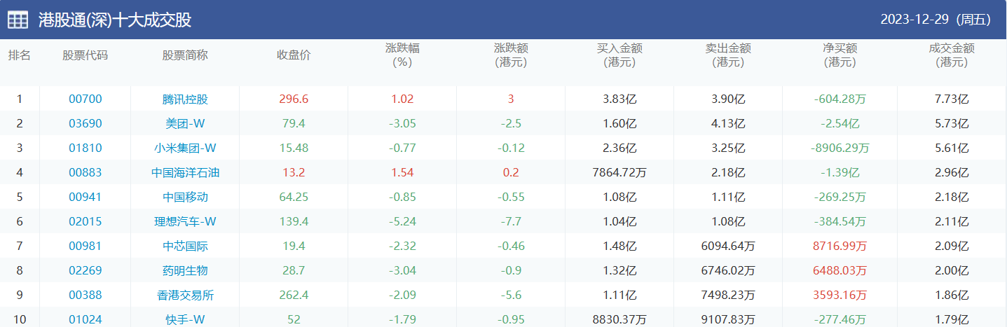 港股通(深)买卖前十股(单位:港元):