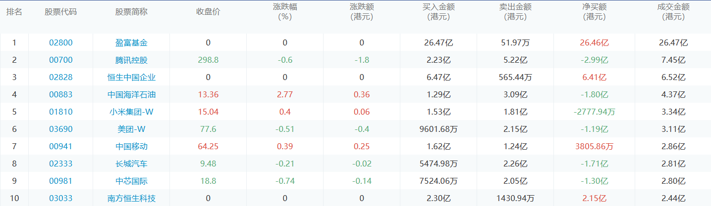 亚汇网1月4日港股通数据统计显示:盈富基金净买入额居首,达26.47亿港元,腾讯控股净卖出额居第一位。
