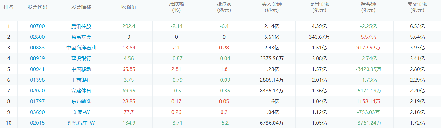 亚汇网1月4日港股通数据统计显示:盈富基金净买入额居首,达5.61亿港元,腾讯控股净卖出额居第一位。